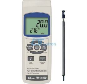 LUTRON AM-4214SD adalah anemometer dengan probe teleskopik, yang dapat mengukur laju aliran gas dalam kisaran 0,2 - 25,0 m/s dan suhu dalam kisaran -100 - 1300 °C dengan termokopel tipe-K, atau dalam kisaran 0 - 50 °C tanpa termokopel eksternal. Perangkat ini mampu menyimpan hasil pengukuran ke kartu SD dalam format .xls MS Excel dan dapat terkoneksi melalui RS232 atau USB.